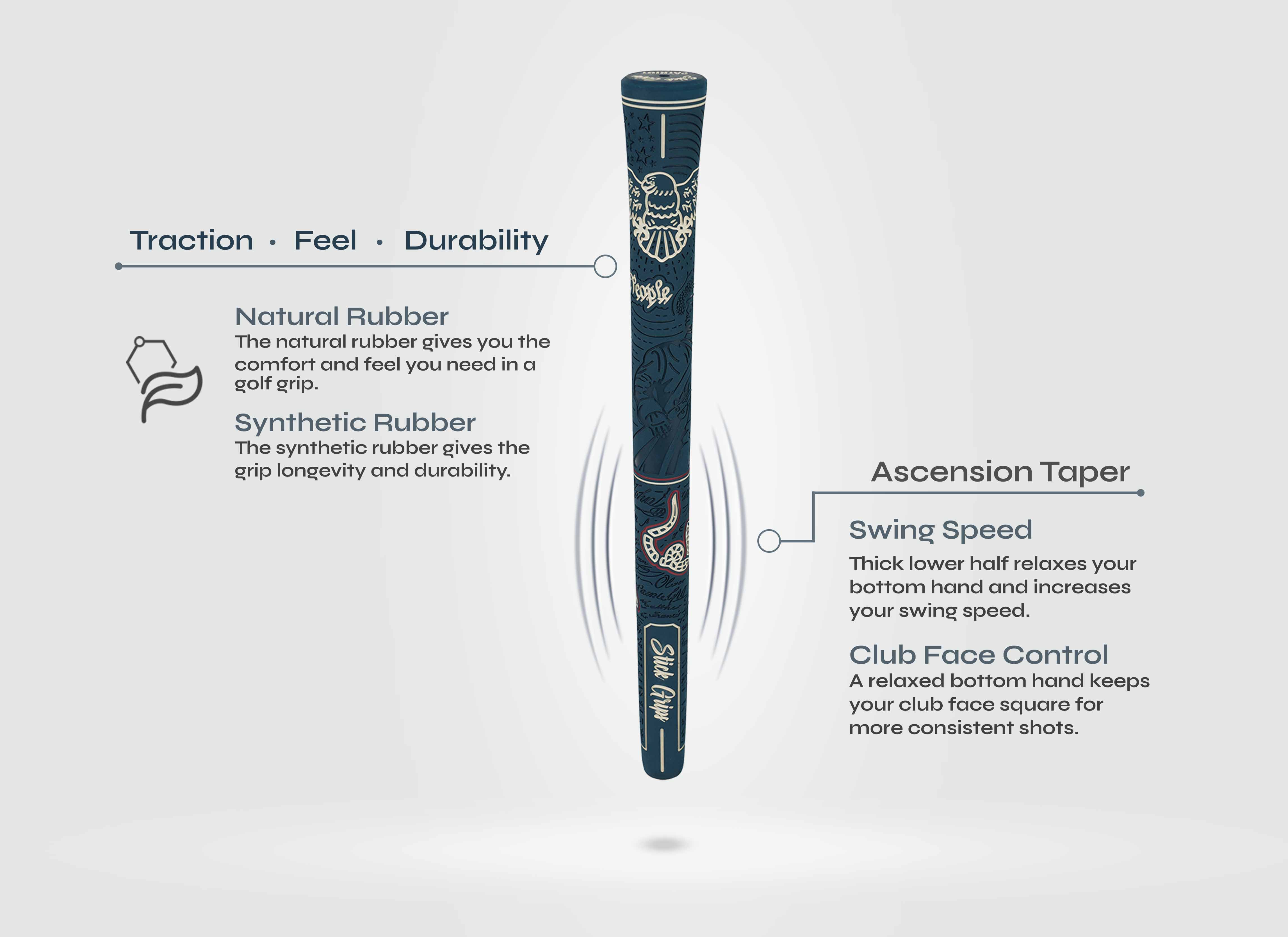 ASCENSION TAPER. This gives the grip a thicker bottom compare to other standard grips. In return it relaxes your lower hand and translates to better club face control and fast swing speed.