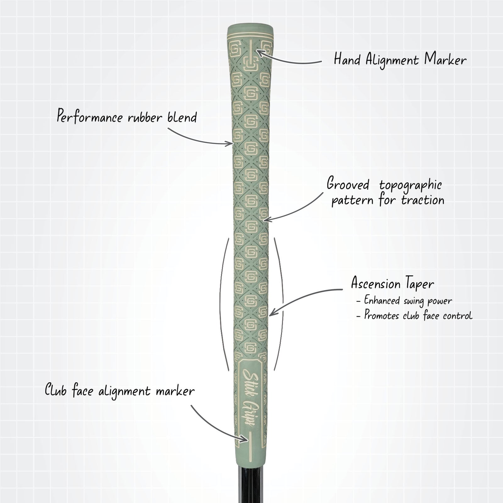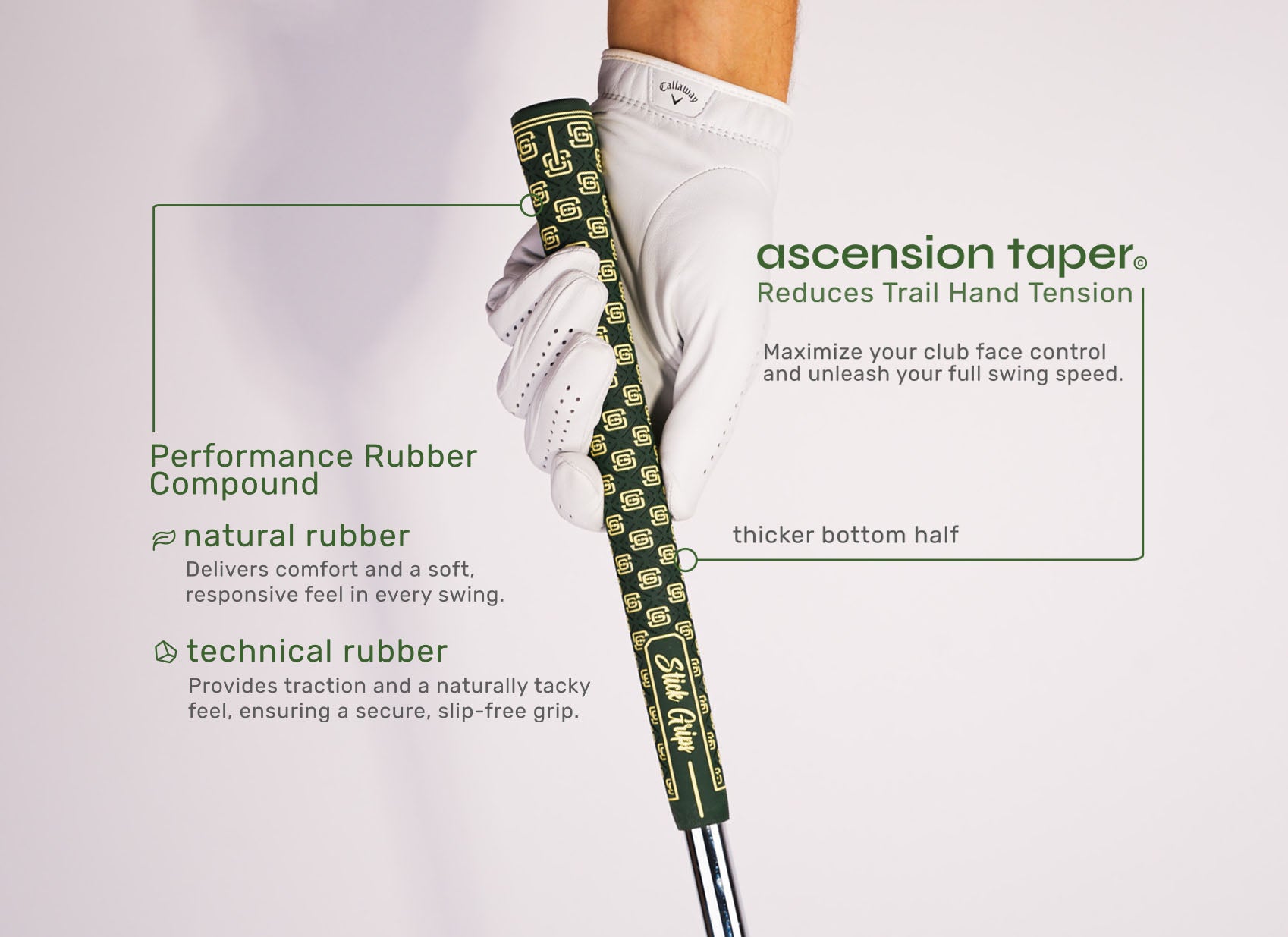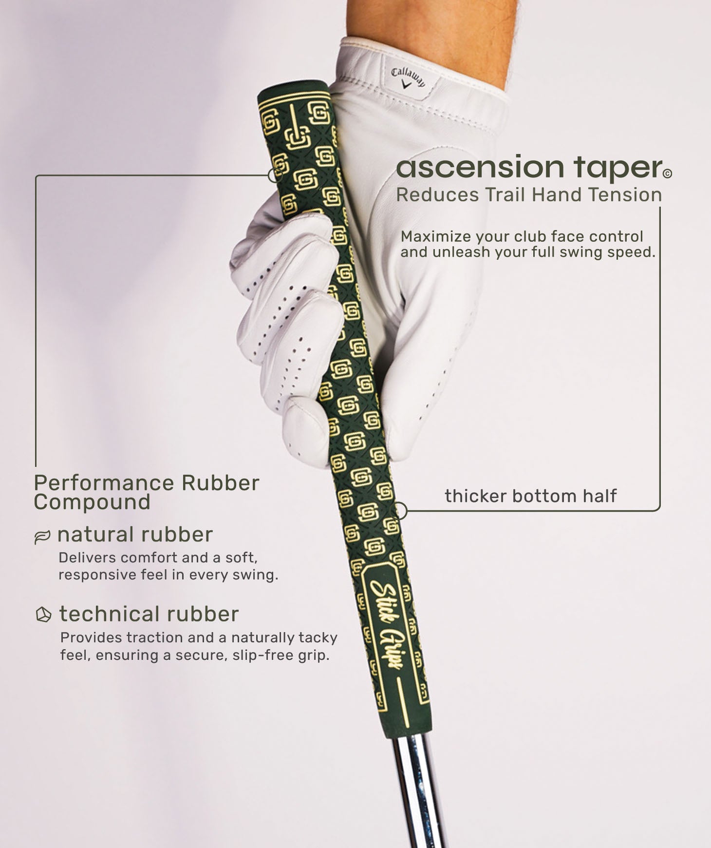 ASCENSION TAPER. This gives the grip a thicker bottom compare to other standard grips. In return it relaxes your lower hand and translates to better club face control and fast swing speed.