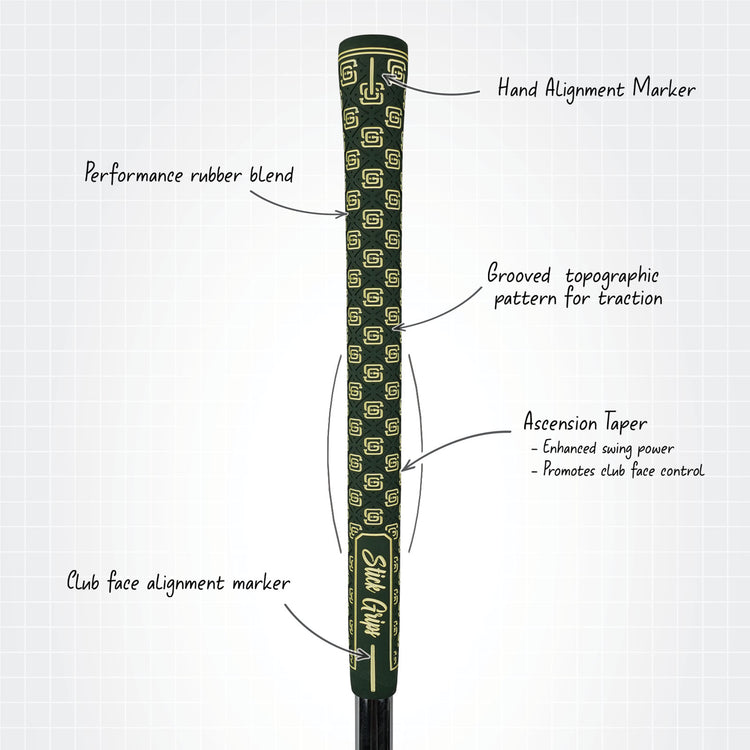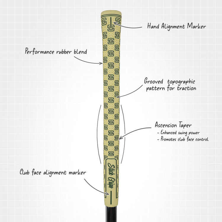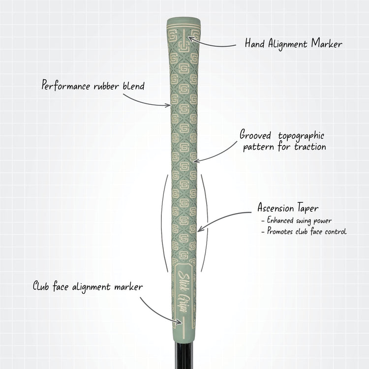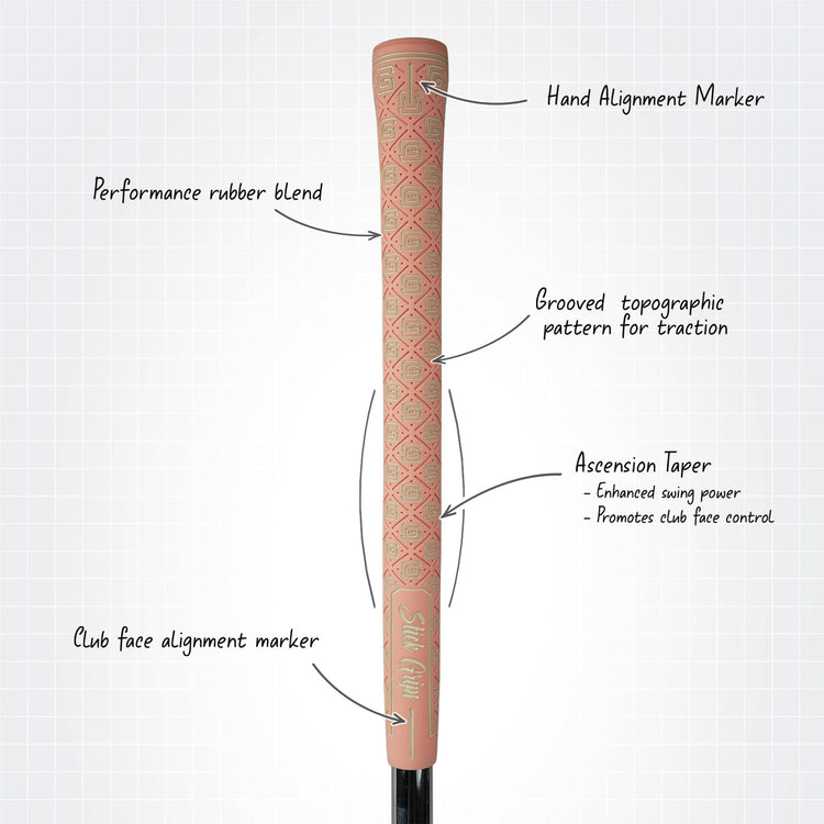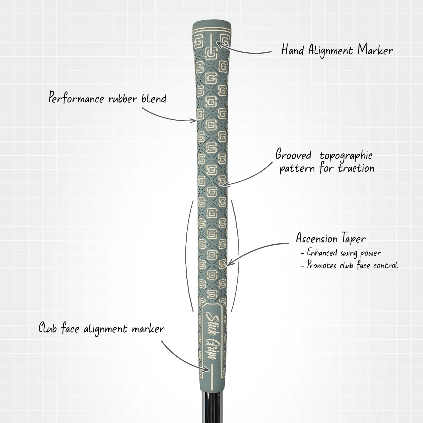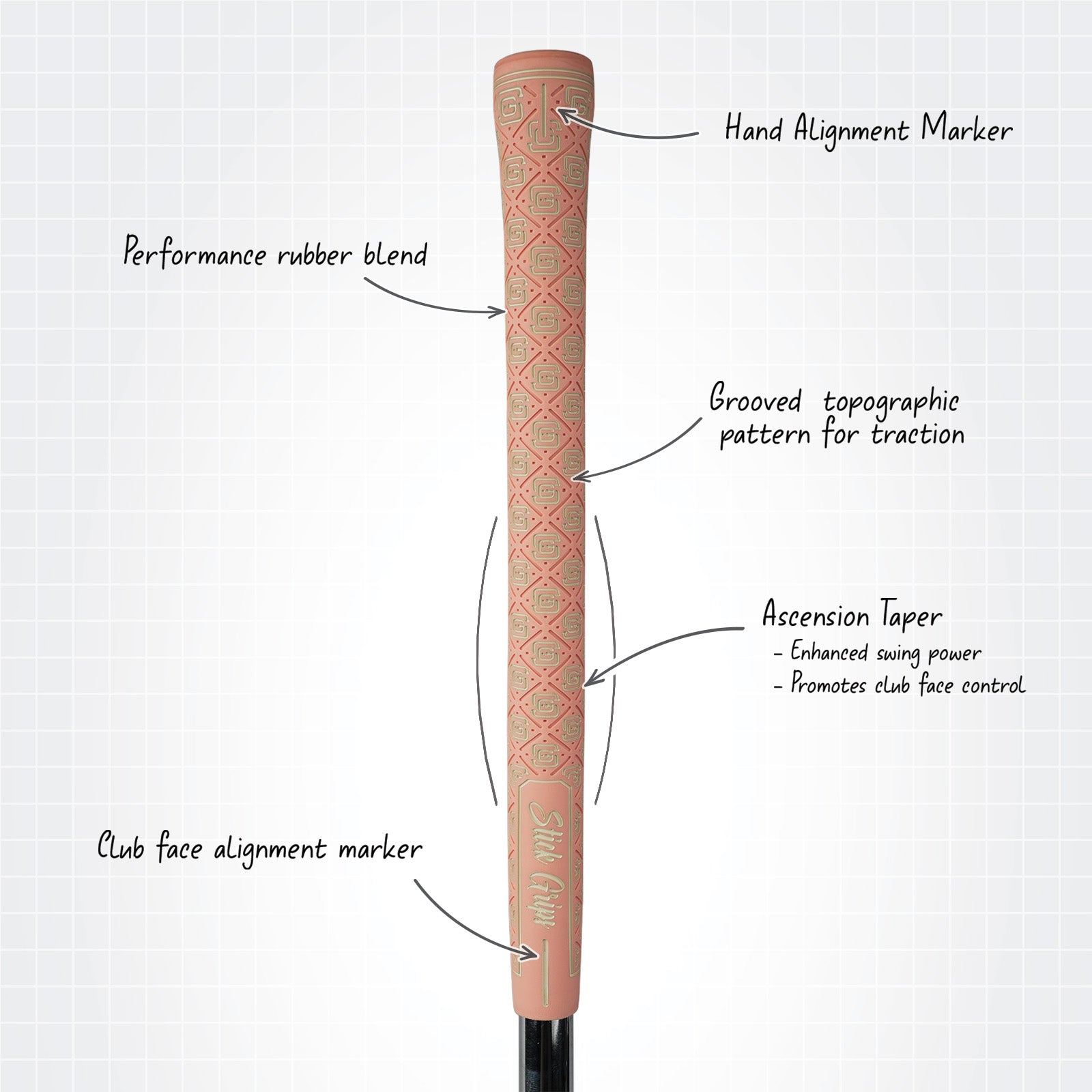 ASCENSION TAPER. This gives the grip a thicker bottom compare to other standard grips. In return it relaxes your lower hand and translates to better club face control and fast swing speed.