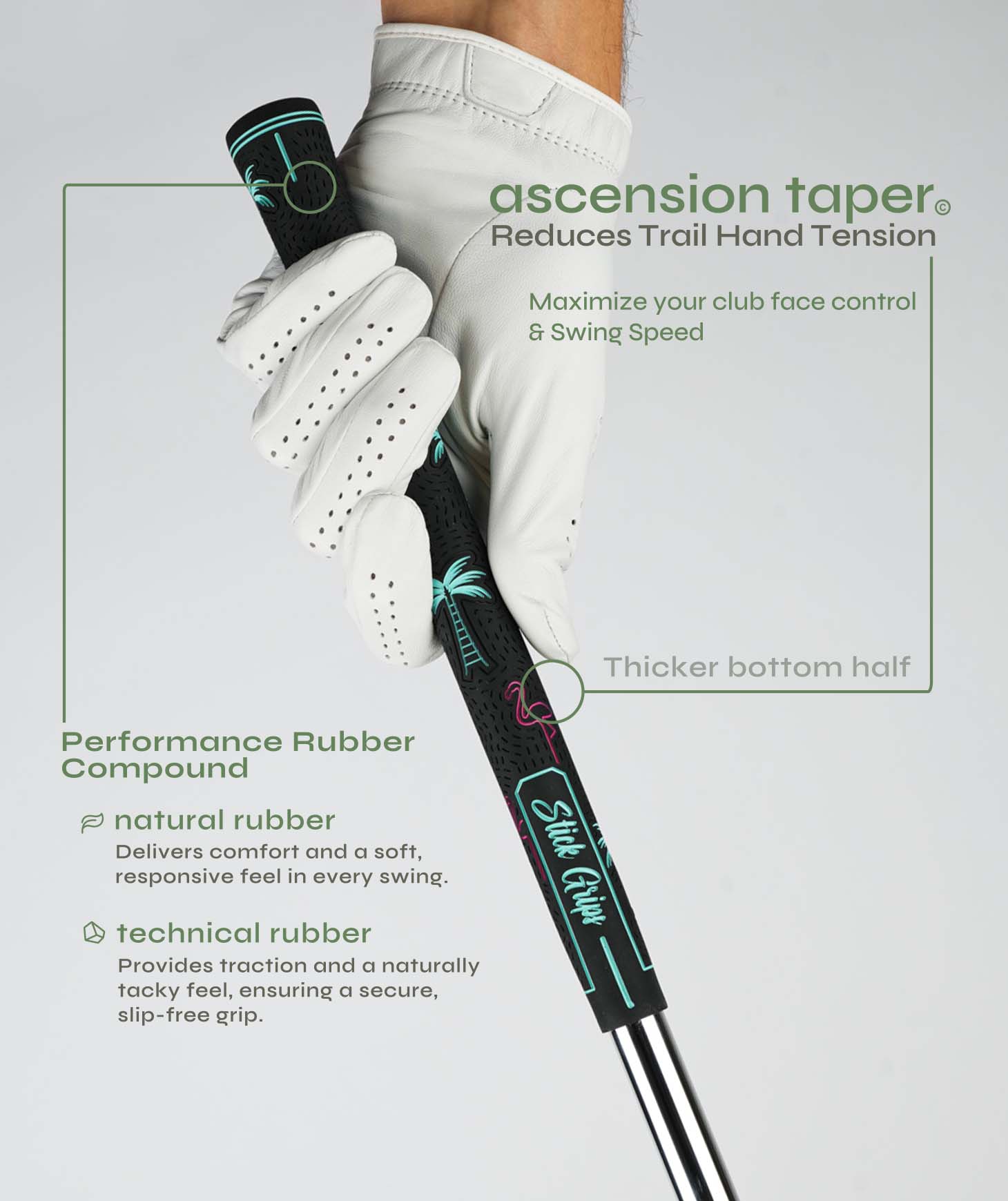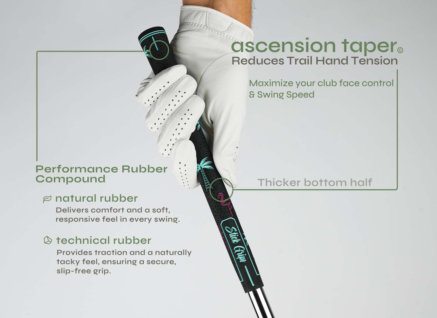 ASCENSION TAPER. This gives the grip a thicker bottom compare to other standard grips. In return it relaxes your lower hand and translates to better club face control and fast swing speed.