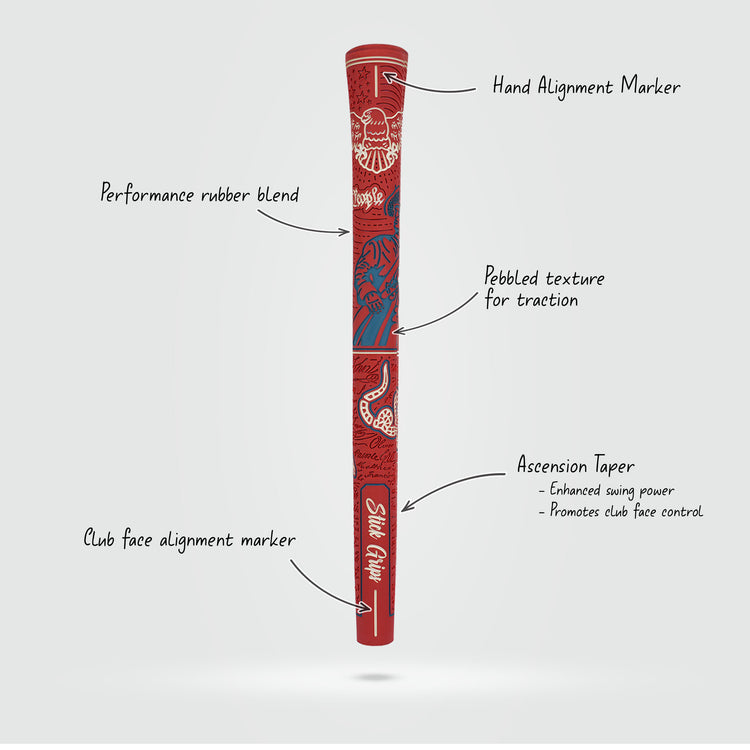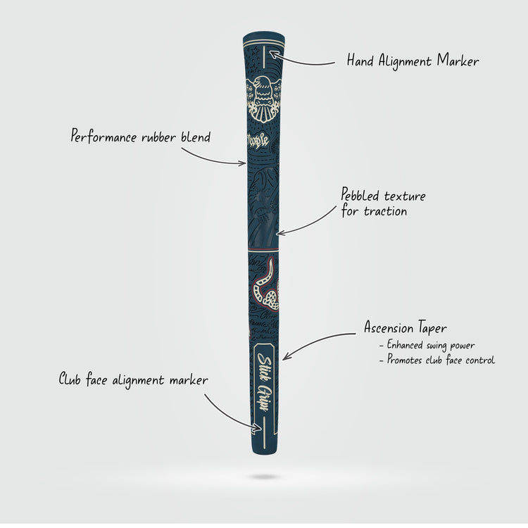 ASCENSION TAPER. This gives the grip a thicker bottom compare to other standard grips. In return it relaxes your lower hand and translates to better club face control and fast swing speed.