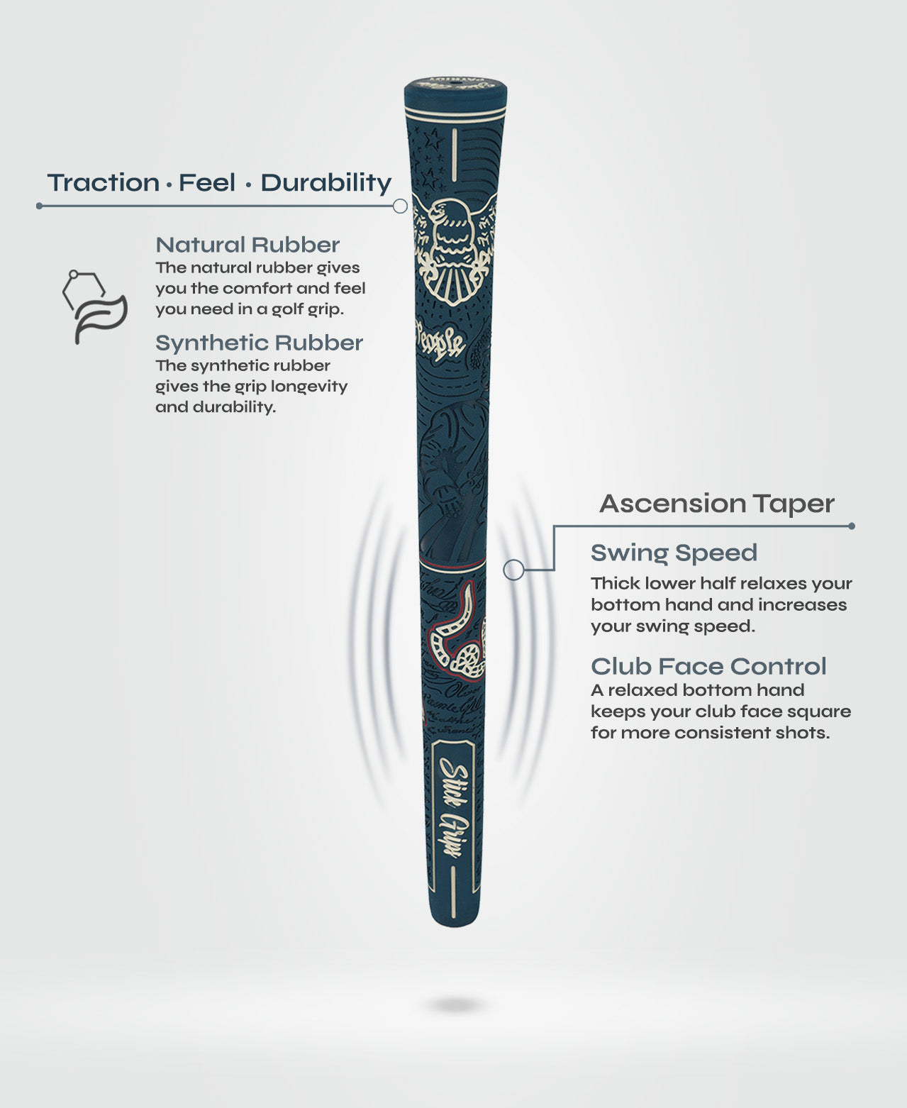 We promise quality, comfort, fit and style and we put that in our Patriot golf grips. The grooved texture through out the grip combined with our performance rubber blend offers a premium grip in all conditions. The thicker lower handle not only provides a premier level of comfort, but enhances your game. Enough about performance..You will look real good too.