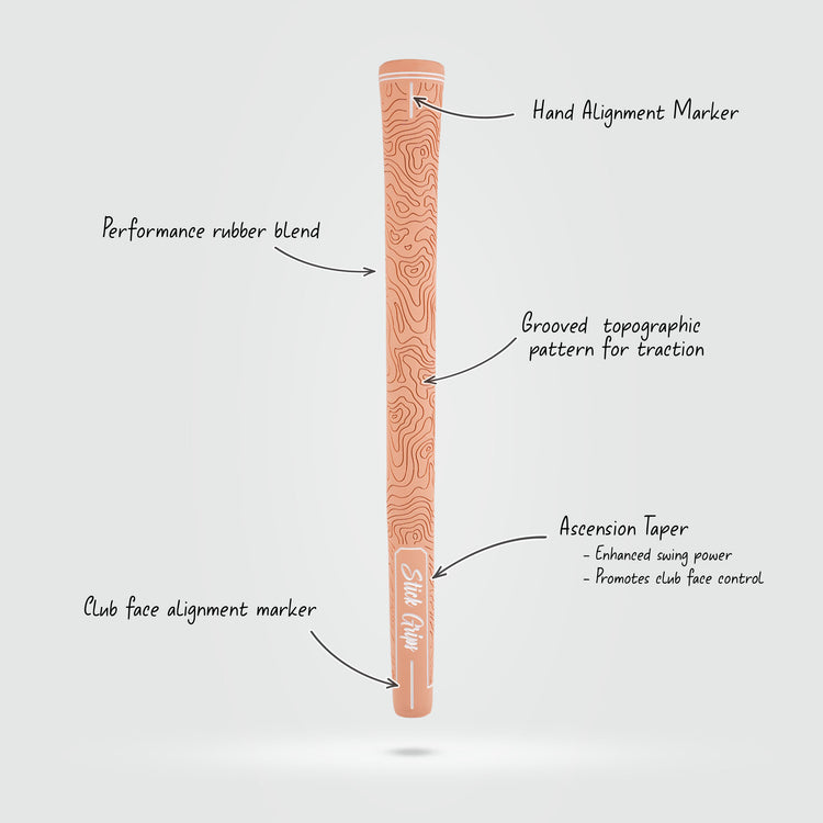 ASCENSION TAPER. This gives the grip a thicker bottom compare to other standard grips. In return it relaxes your lower hand and translates to better club face control and fast swing speed.